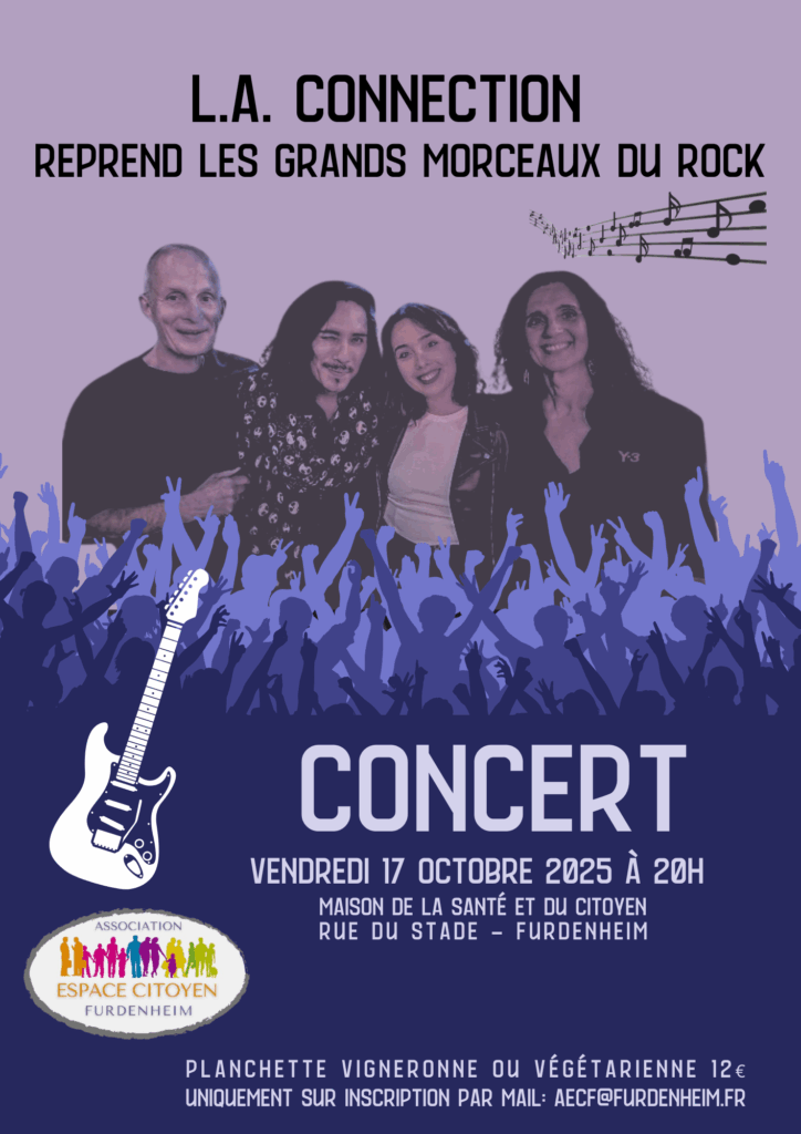 Le 17 Octobre, L’AECF (Association Espace Citoyen du Furdenheim) vous propose une soirée concert Rock avec planchettes repas. Venez Ecouter Octavio et les L.A. CONNECTION reprendre les standarts du rock. Soirée sur inscription à aecf@furdenheim.fr. Planchette repas vigneronne ou végé: 12€